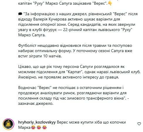У соцмережах Козловський з іронією відреагував на трансферні чутки: «Верес може купити хіба що копочки Марка».