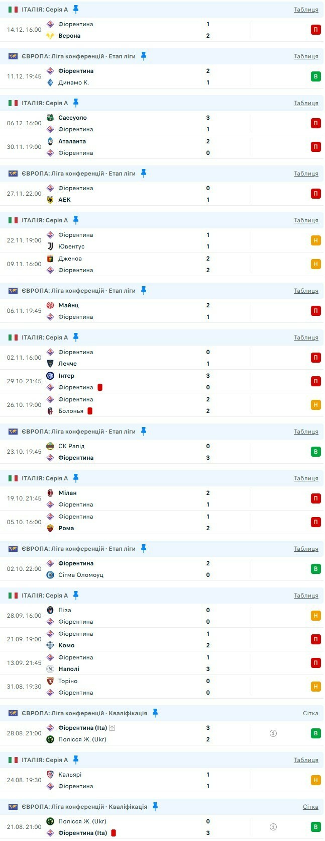 У сезоні 2025/26 Фіорентина здобула лише 5 перемог у 21 матчі в усіх турнірах. При цьому три з них команда оформила у протистояннях з українськими клубами – Поліссям та Динамо.