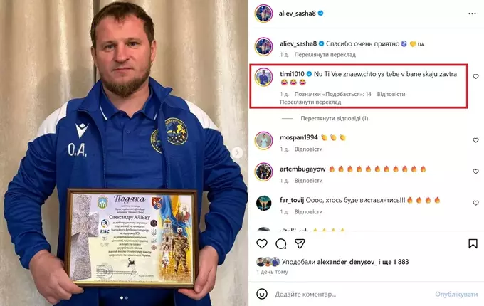 Колишній півзахисник збірної України та київського «Динамо» Олександр Алієв показав відзнаку, яку отримав від Територіального центру комплектування (ТЦК).