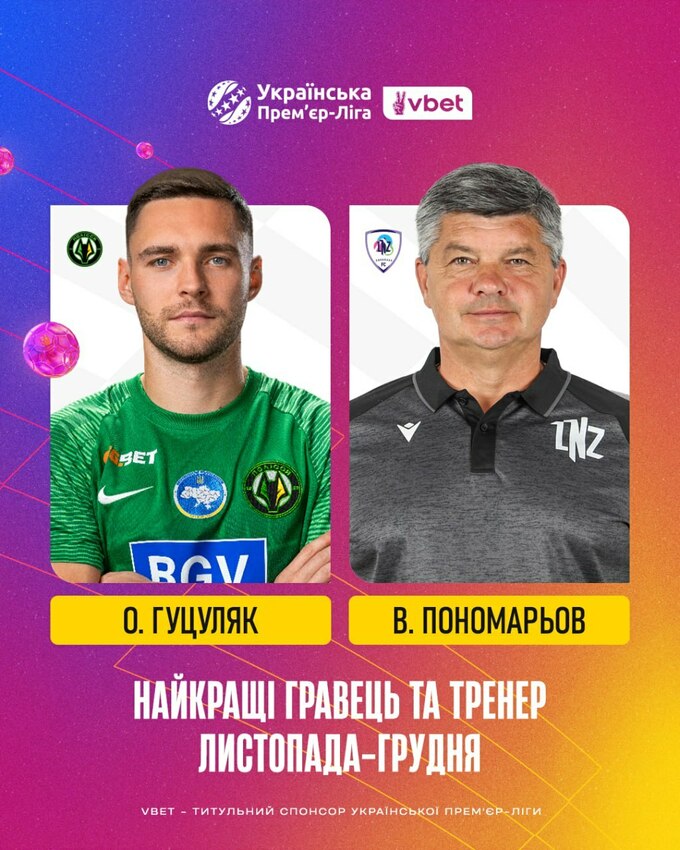 Хавбек Полісся Олексій Гуцуляк та коуч ЛНЗ Віталій Пономарьов стали найкращим гравцем та тренером УПЛ відповідно у листопаді та грудні.