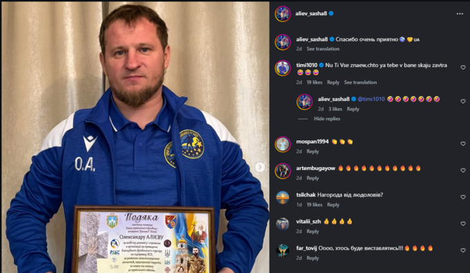 22 грудня колишній півзахисник національної збірної України та київського «Динамо» Олександр Алієв повідомив, що отримав подяку від ТЦК і СП.