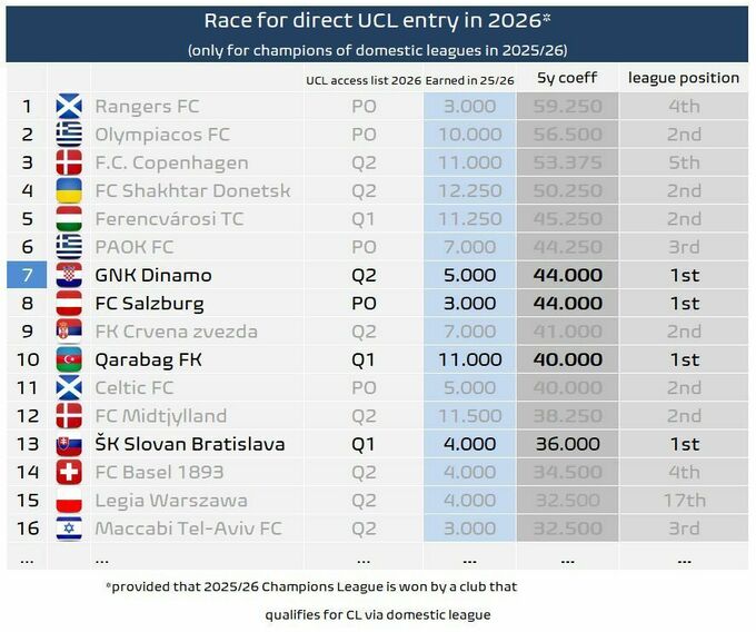 Позиції Рейнджерс (59,250), 4-го у Шотландії, та Копенгагена (53,375), 5-го у Данії, в рейтингу виглядають менш конкурентними через їх становище в національних чемпіонатах. Лідирують у своїх чемпіонатах лише Динамо Загреб і РБ Зальцбург (по 44.000), але немає жодної впевненості, що до них дійде черга.