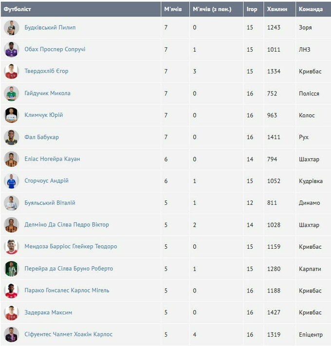 Топ-бомбардири сезону УПЛ 2025/26: Пилип Будківський (Зоря Луганськ), Проспер Оба (ЛНЗ Черкаси), Єгор Твердохліб (Кривбас Кривий Ріг), Микола Гайдучик (Полісся Житомир), Юрій Климчук (Колос Ковалівка), Бабукар Фаал (Рух Львів) – по 7 голів.