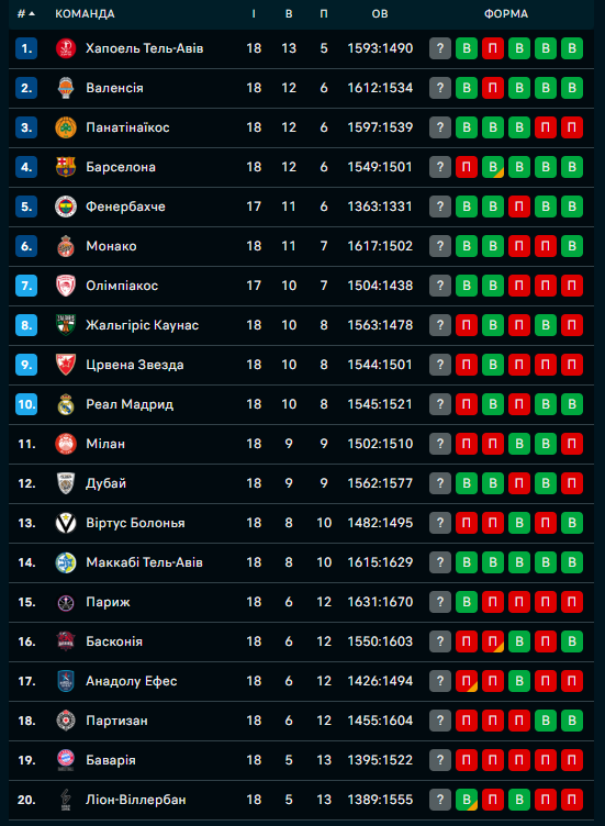 Завершився 18-й тур Євроліги
