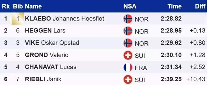 Йоханнес випередив найближчого конкурента Ларса Хеггена на 0.13 секунди, а від третього місця Оскара Опстада Віке він відірвався на 0.80 секунди.