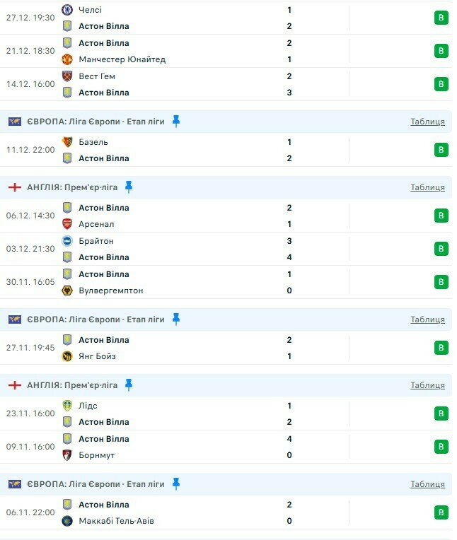 Переможна серія Астон Вілли в усіх турнірах (11 матчів)