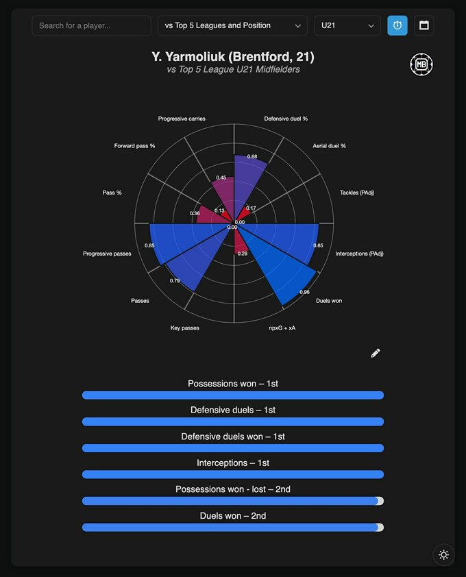 Український півзахисник «Брентфорда» Єгор Ярмолюк очолює одразу декілька статистичних рейтингів серед хавбеків у віці до 21 року, які виступають у п'яти провідних чемпіонатах Європи.