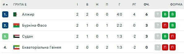 Становище у групі E: Алжир (6 очок), Буркіна-Фасо, Судан (по 3), Екваторіальна Гвінея (0).