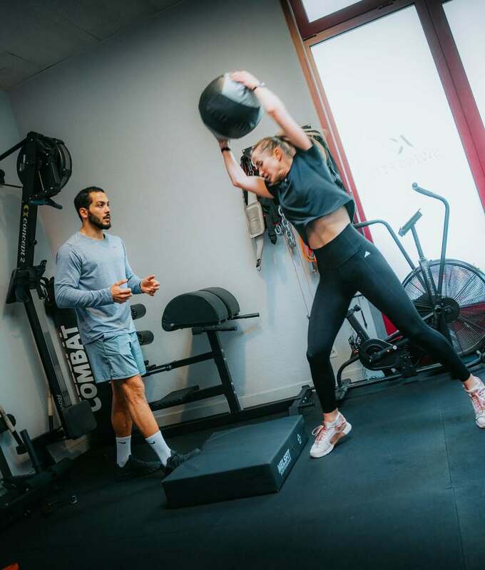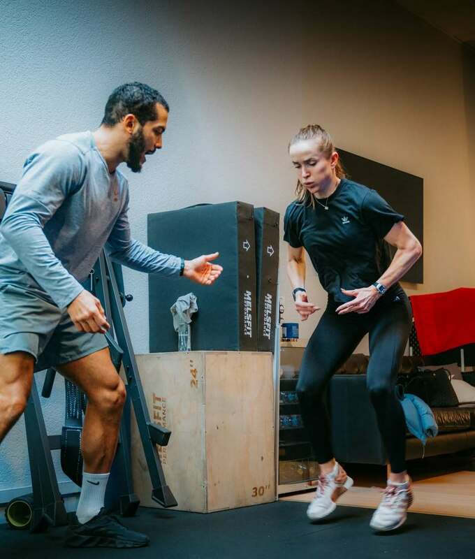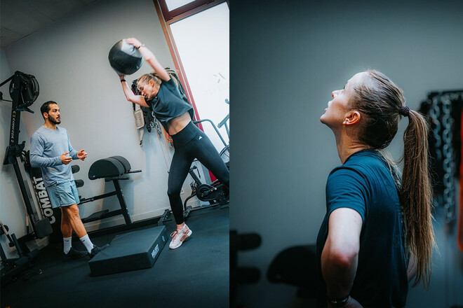 На світлинах тенісистка працює в тренажерному залі під керівництвом тренера, виконуючи силові вправи та підтримуючи чудову фізичну форму.