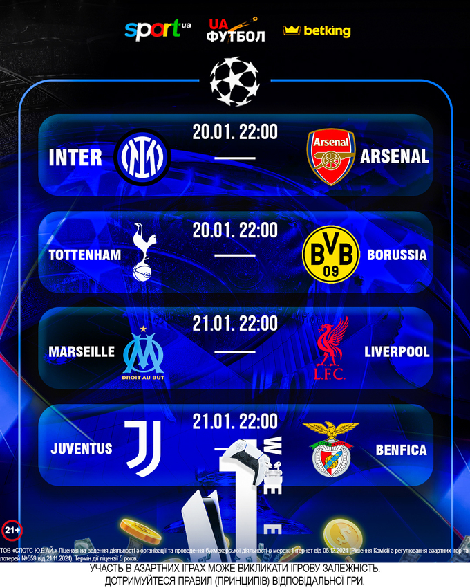 - Ярослав Перканюк: Інтер – Арсенал [Фора (1) 0 за 1.90], Ювентус – Бенфіка [Перемога Ювентуса за 1.78]