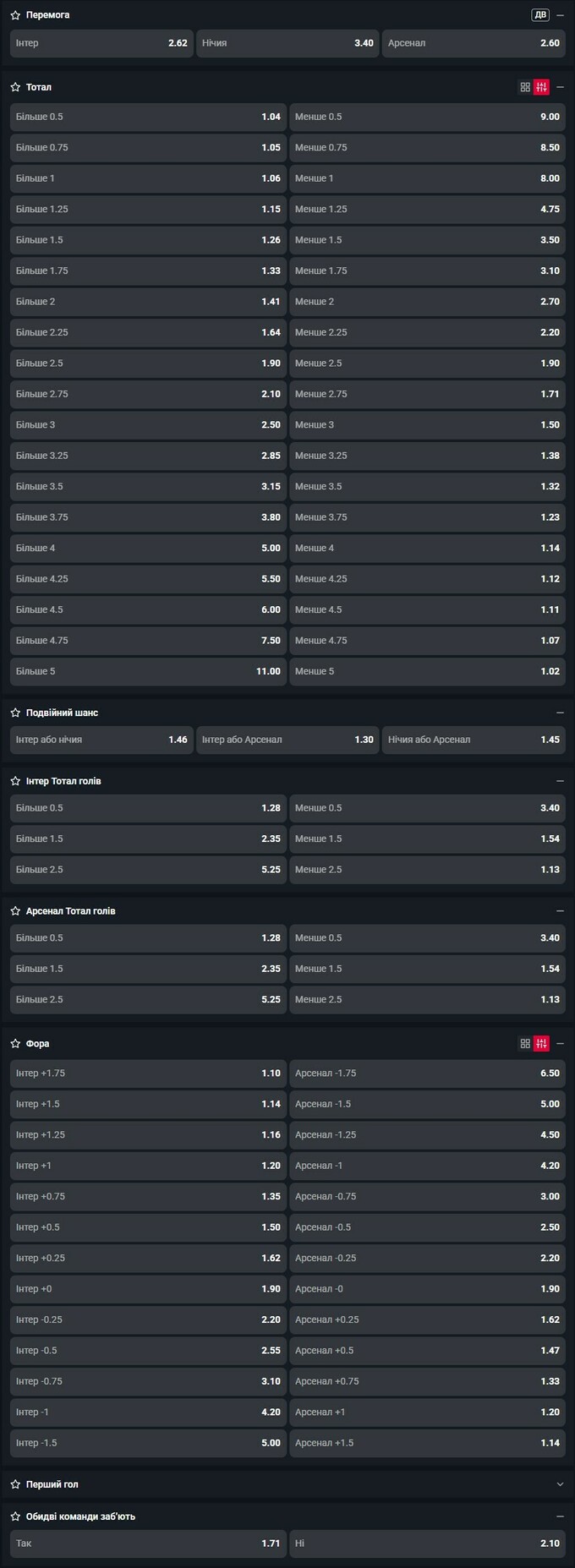 Лінія та коефіцієнти на матч Інтер – Арсенал