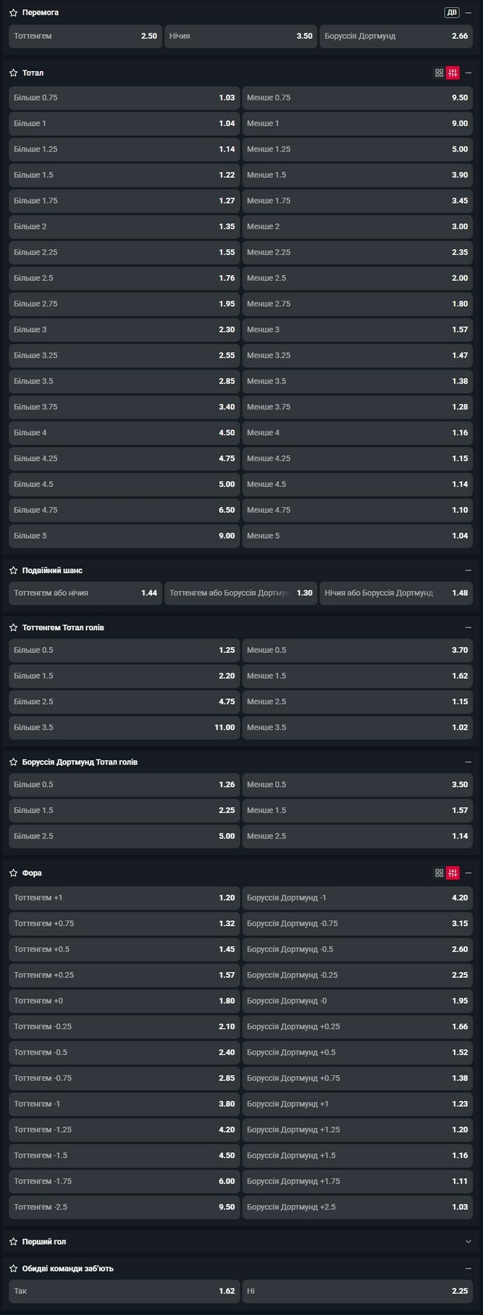 Лінія та коефіцієнти на матч Тоттенхем – Боруссія Д