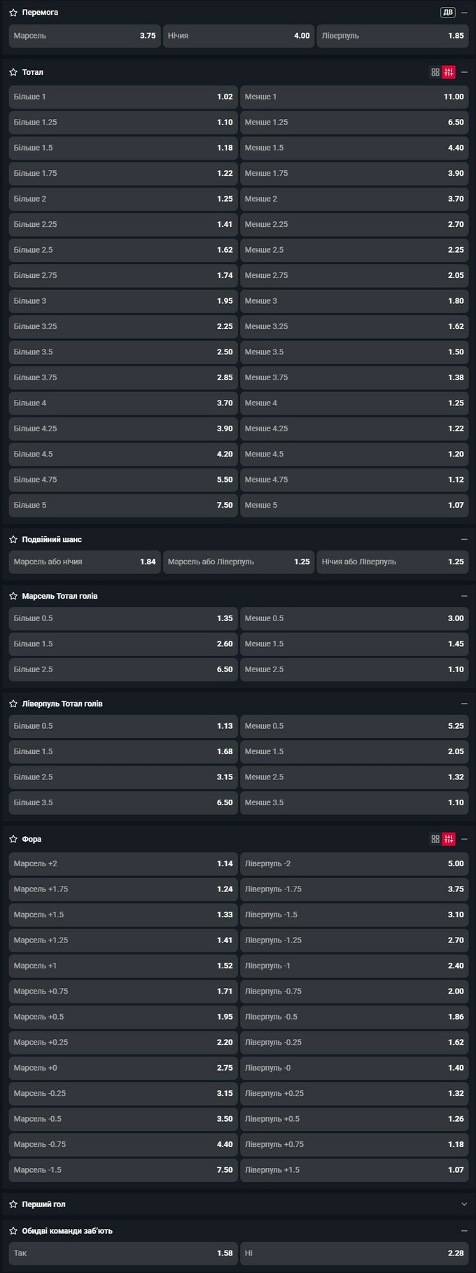 Лінія та коефіцієнти на матч Марсель – Ліверпуль