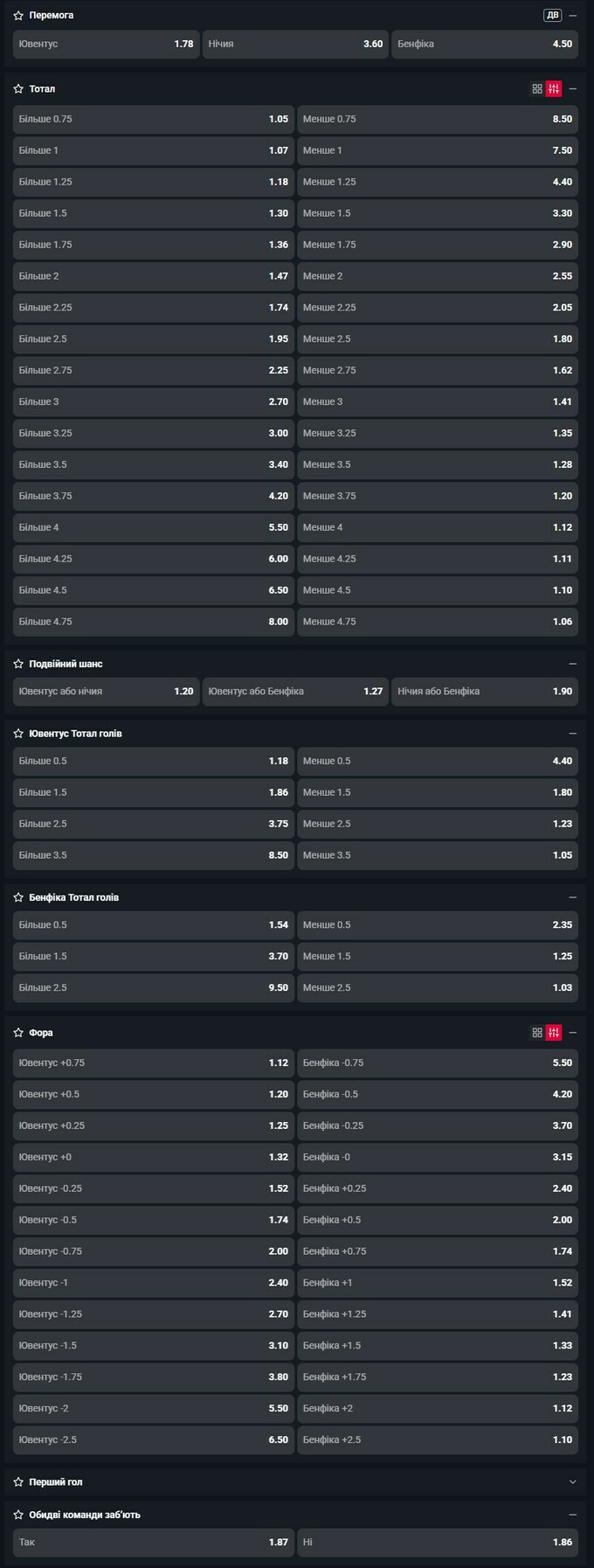 Лінія та коефіцієнти на матч Ювентус – Бенфіка