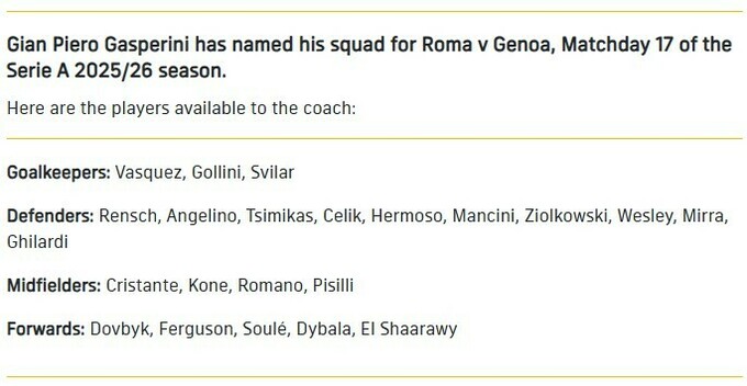 «Рома» опублікувала заявку на матч 17-го туру Серії А із «Дженоа», який відбудеться в понеділок, 29 грудня, о 21:45 за київським часом.