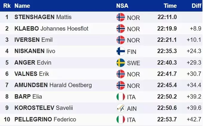 Вперше в кар'єрі норвезький лижник Маттіс Стенсхаген виграв гонку, подолавши дистанцію за 22 хвилини та 9 секунд.