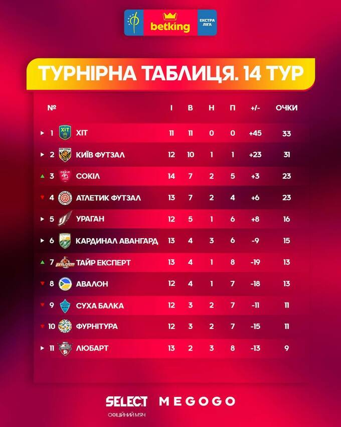 Турнірна таблиця Екстраліги з футзалу (станом на 29.12.2025)