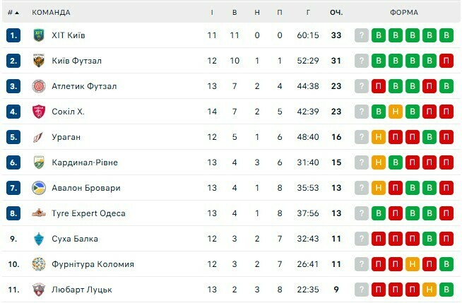 Другу позицію посідає Kyiv Futsal (31 бал), Атлетік Дніпро та Сокіл Хмельницький ділять третє місце (по 23 пункти). Далі йдуть Ураган (16) та Кардинал (15).