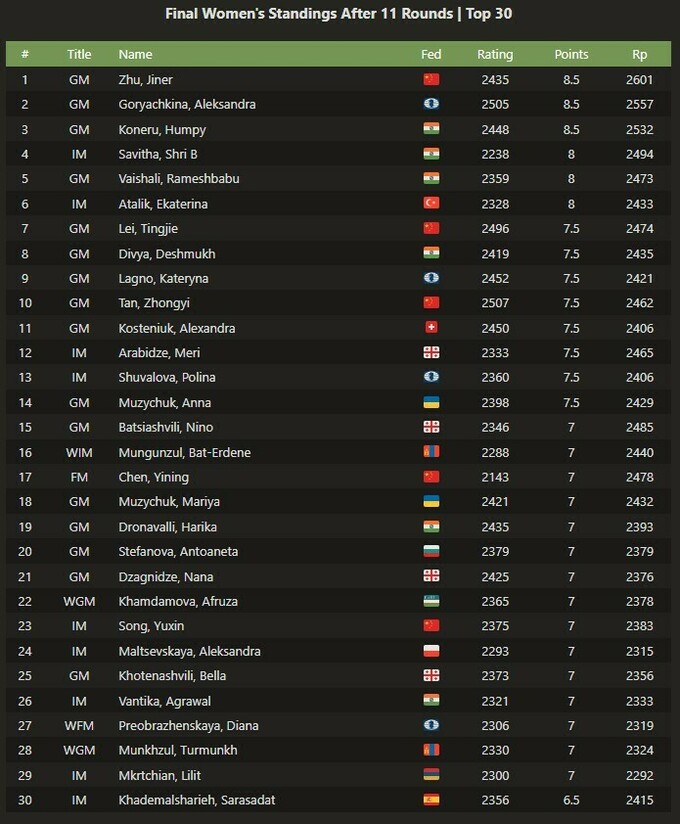 - 1. Александра Горячкіна (нейтральна) – 8,5 очок з 11 (фінал: 1,5)