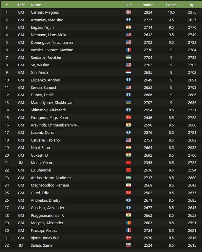 - 1. Магнус Карлсен (Норвегія) – 10,5 очок з 13