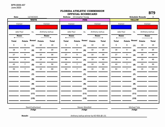 Усі три судді віддали перші чотири раунди з рахунком 10:9 на користь Джошуа. У п’ятому та шостому раундах Джейк Пол по два рази опинявся в нокдауні, через що ці раунди були оцінені як 10:7. Після четвертого нокдауну рефері зупинив поєдинок.