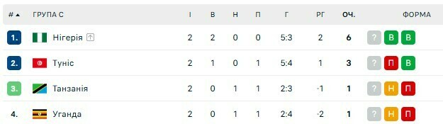 Нігерія (6 очок) достроково вийшла у плей-оф, далі йдуть: Туніс (3), Танзанія та Уганда (1).