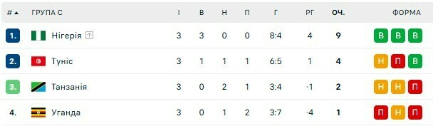 Група C: Нігерія (9 очок), Туніс (4) та Танзанія (2) вийшли до 1/8 фіналу, а Уганда (1) залишає турнір.