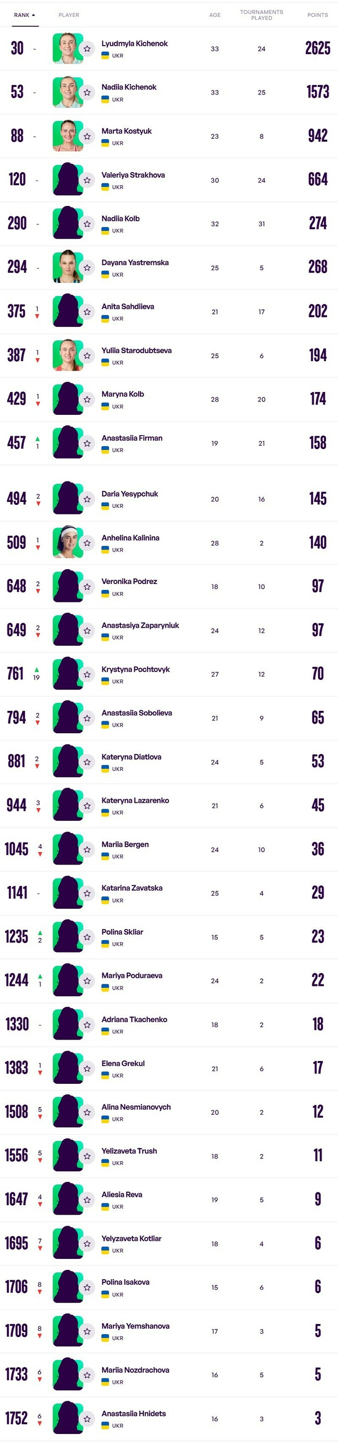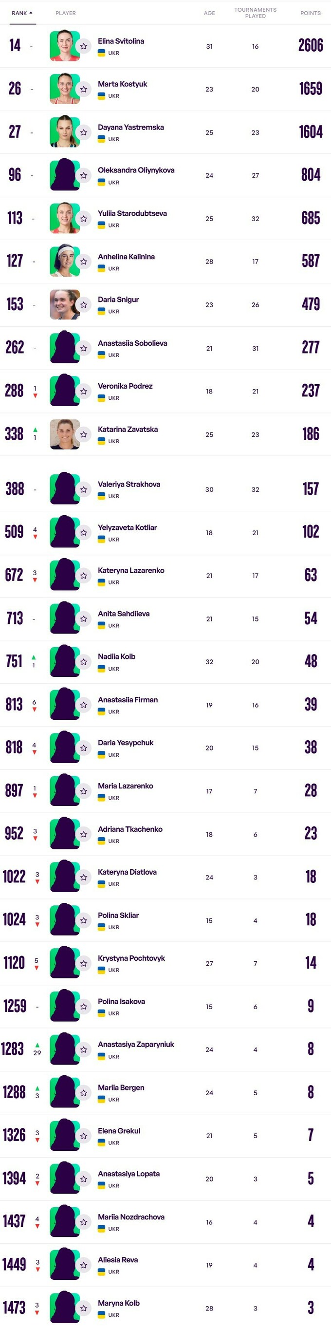 У топ-500 входять ще шість представниць України: Юлія Стародубцева, Ангеліна Калініна, Дар'я Снігур, Анастасія Соболєва, Вероніка Подреє і Катаріна Завацька.