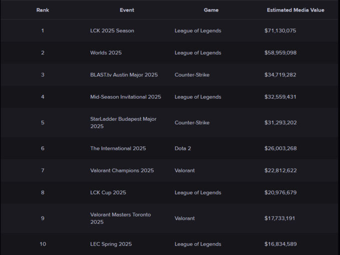 Рейтинг подій 2025 року за Media Value показав, що найбільшу цінність створюють не лише глобальні турніри, а й стабільні регіональні ліги. Лідером несподівано стала LCK Season 2025, яка завдяки тривалому формату та сильним ринкам перевершила навіть League of Legends World Championship 2025, згенерувавши понад 71 мільйон доларів умовної медіавартості.