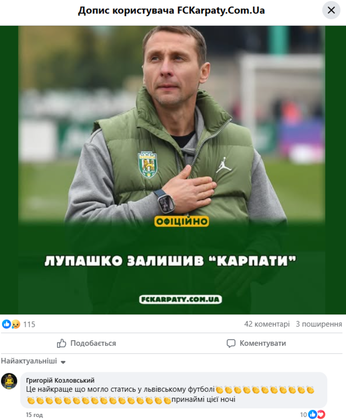 «Це найкраще, що могло статись у львівському футболі, принаймні цієї ночі», – написав Козловський у коментарях у соцмережах.