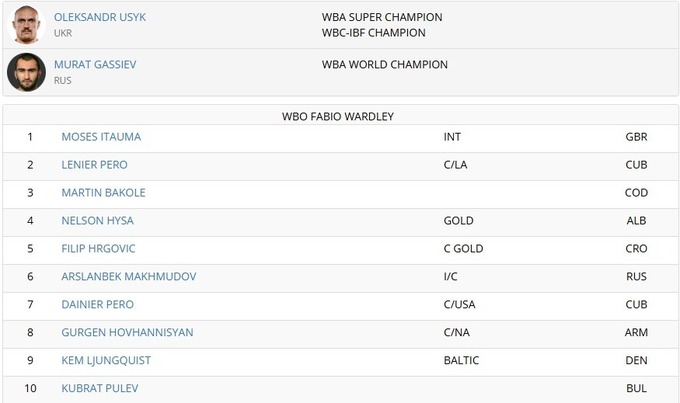 Всесвітня боксерська асоціація (WBA) опублікувала оновлену версію рейтингу в хевівейті