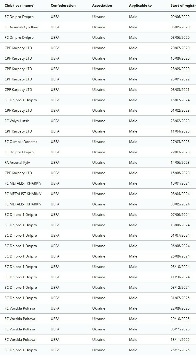 FIFA Registration Bans. Українські клуби, щодо яких діє трансферний бан