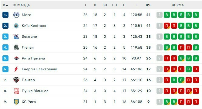 Турнірне становище: Мого, Київ Кепіталз (41), Земгале, Лієпая (38), Рига Призма (26), Енергія Електренай (17), Пантер (16), Пункс Вільнюс (10), ХК Рига (9).