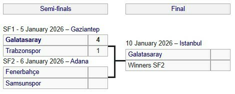 Галатасарай зі Стамбула без особливих проблем виграв у Трабзонспора (4:1) та вийшов до фіналу Суперкубка Туреччини (10 січня у Стамбулі), де боротиметься за трофей проти переможця пари Фенербахче – Самсунспор, які зіграють 6 січня.