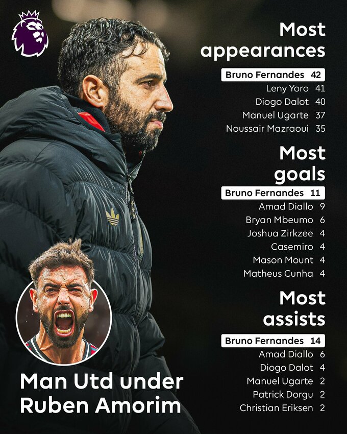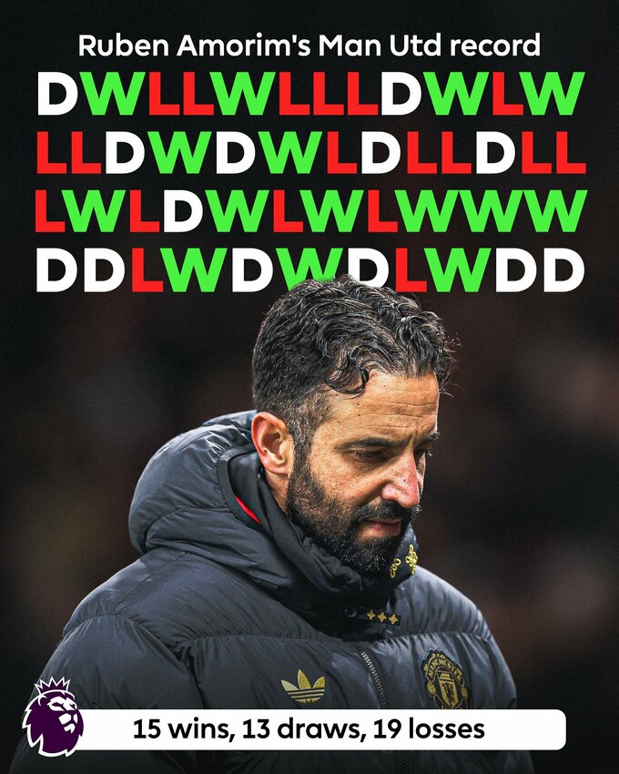 Повна статистика Рубена Аморіма в офіційних матчах з МЮ: 63 гри, 24 перемоги, 18 нічиїх, 21 поразка.