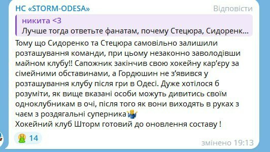 Під час останнього виїзду збірної України в Румунію ви, мабуть, помітили, що на майданчику був відсутній Ілля Крикля (гравець «Шторма» - авт.). Так ось, Ілля, який отримав травму в збірній, був одним зі списку травмованих. Та попри медичну реабілітацію з боку ФХУ хокеїст змушений був повернутися до клубу. Жодної пропозиції чи зацікавленості станом Іллі з моменту нашого звернення до головного лікаря збірної у ФХУ не виникало. Замість того, щоб піти на зустріч клубу з певною кількістю травмованих гравців, ФХУ зараховує технічну поразку. Якщо вам скажуть, що ми надіслали щось несвоєчасно, то ми можемо допомогти ще одному новоствореному клубу (вочевидь мова про «Одещину» - авт.) почати грати за правилами».