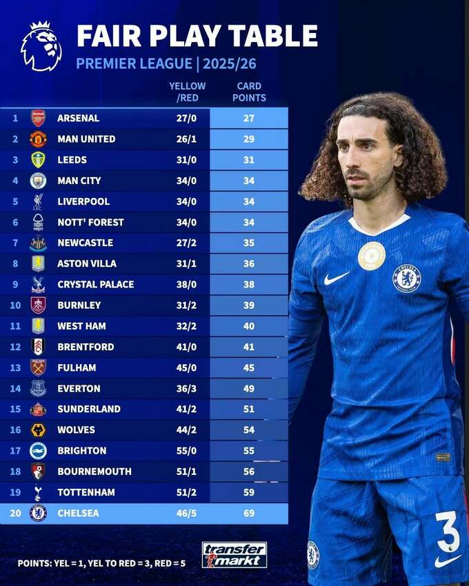 Тепер в пасиві Челсі 69 карткових очок, що на 10 більше, ніж має Тоттенгем Готспур, який розташований на передостанньому місці в таблиці Fair Play.