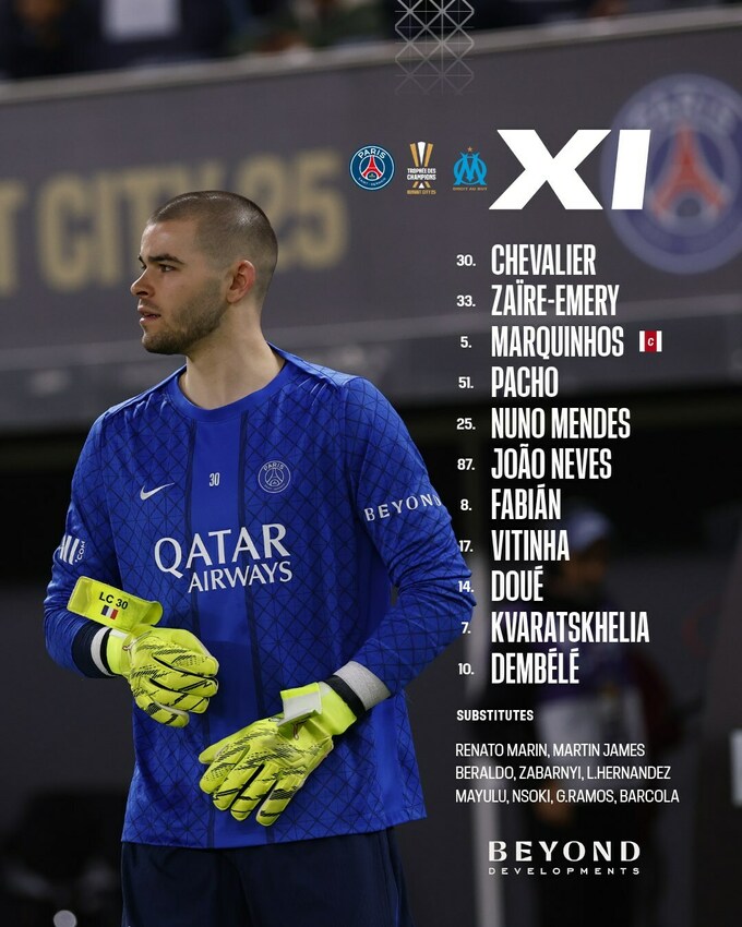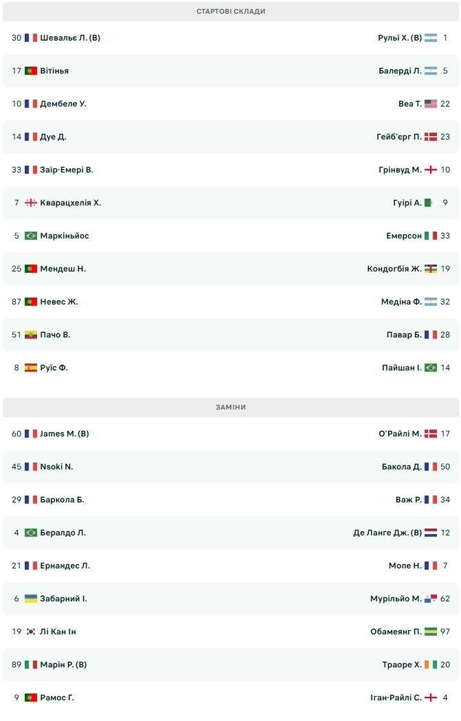 ПСЖ: Шевальє, Заїр-Емері, Маркіньос, Пачо, Нуну Мендеш, Вітінья, Жоау Невеш, Фабіан Руїс, Дембеле, Дуе, Кварацхелія.