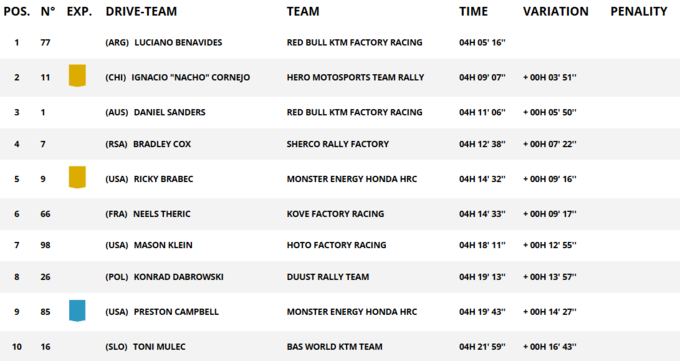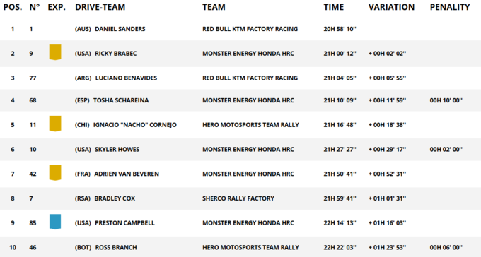 У загальному заліку мотоциклів лідирує Сандерс із сумарним часом 20 год 58 хв 10 с. На другій позиції йде американський пілот Рікі Брабек із Monster Energy Honda HRC, який відстає на 2 хвилини 2 секунди, тоді як третє місце посідає Бенавідес із відставанням 5 хвилин 55 секунд від лідера.