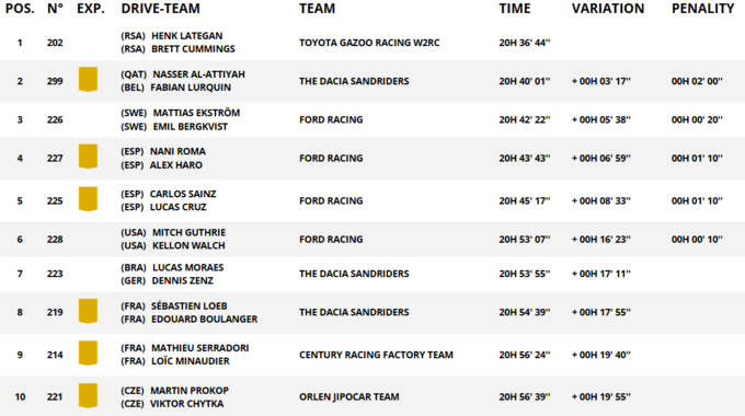 Для Toyota етап склався значно важче: Жоау Феррейра фінішував лише восьмим у найкращому з Hilux, тоді як лідер загального заліку Латеган, стартуючи першим без навігаційних слідів, втратив майже 13 хвилин і завершив день 16-м. Попри це, південноафриканець утримав загальне лідерство, хоча його перевага над Нассером Аль-Аттією скоротилася до 3 хвилин 17 секунд.