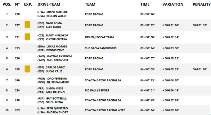 У підсумку Рома став другим, а третє місце посів Мартін Прокоп на клієнтському Ford Raptor. Ще троє пілотів Ford завершили день у топ-7 – Денніс Кротов, Маттіас Екстрьом і Карлос Сайнс-старший. Єдиним, хто зумів «вклинитися» між численними Ford, став чинний чемпіон світу з ралі-рейдів Лукас Мораес, який привів Dacia на четверту позицію.