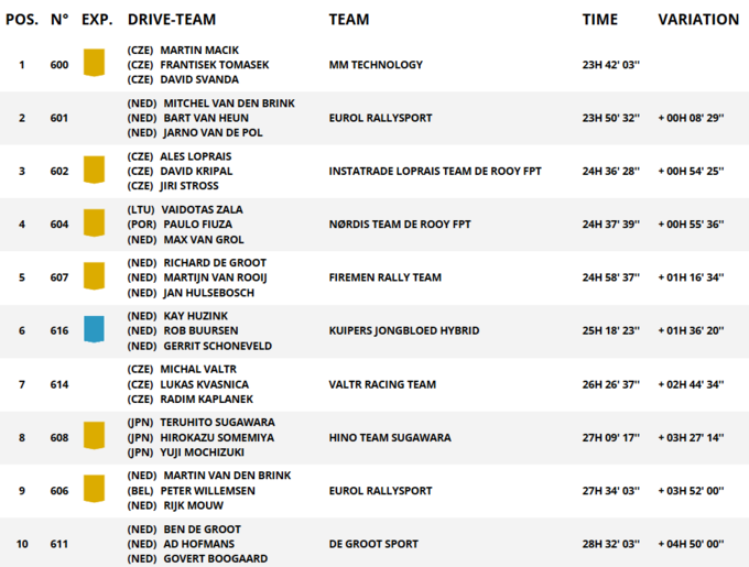 Серед вантажівок перемогу здобула чеська команда Мартін Мацик, Франтішек Томашек і Давід Шванда з MM Technology із часом 4 години 30 хвилин 26 секунд. Друге місце посіла нідерландська трійка Кей Гузінк, Роб Бурсен і Герріт Шоневельд з Kuipers Jongbloed Hybrid, відставши на 3 хвилини 18 секунд. Третє місце дісталося Мітчелу ван ден Бринку, Барту ван Хеуну і Ярно ван де Полу із Eurol Rallysport із відставанням 4 хвилини 1 секунда.