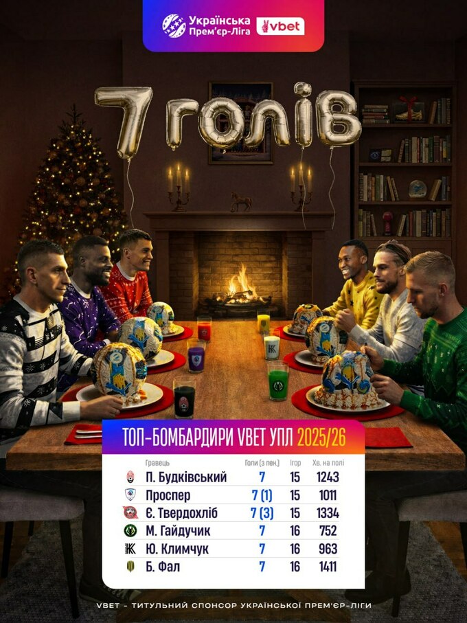 Топ-бомбардири сезону УПЛ 2025/26: Пилип Будківський (Зоря Луганськ), Проспер Оба (ЛНЗ Черкаси), Єгор Твердохліб (Кривбас Кривий Ріг), Микола Гайдучик (Полісся Житомир), Юрій Климчук (Колос Ковалівка), Бабукарр Фаал (Рух Львів) – по 7 голів.