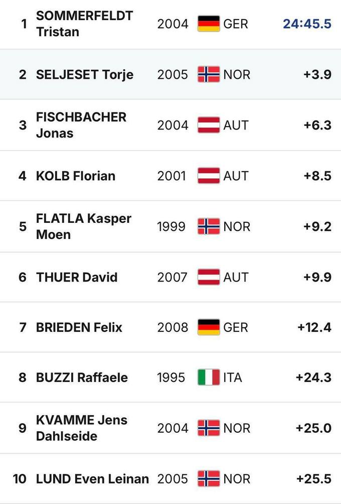 Переможцем став 21-річний німець Трістан Зоммерфельдт. Другу та третю позицію посіли норвежець Тор’є Сельєсета та австрієць Йонас Фішбахер.