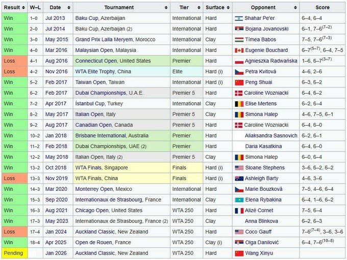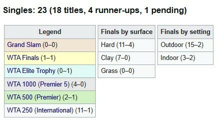 Серед її перемог – WTA Finals 2018 (найпрестижніший турнір після гран-слемів), а також численні титули серій WTA 1000 (4 трофеЇ), WTA 500 (2 перемоги) та WTA 250 (11 звитяг) на різних покриттях.