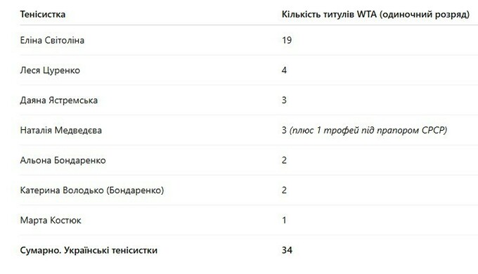 Сумарно. Українські тенісистки: 34 титули WTA