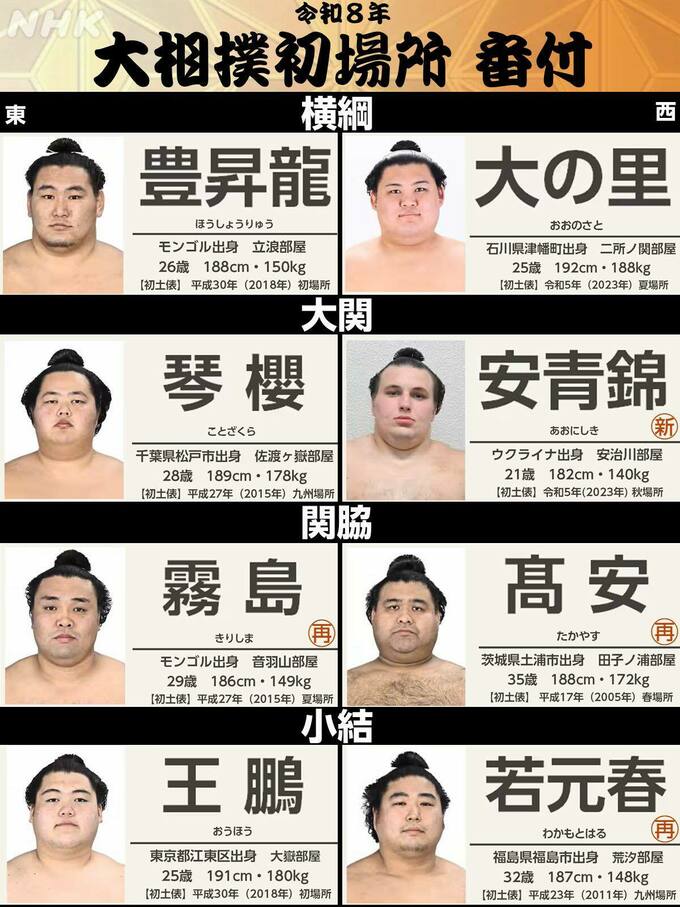 Звісно, в Японії до перспектив українця виграти другий юшо поспіль ставляться обережно. Головним фаворитом Hatsu Basho вважається переможець трьох з шести турнірів 2025 року йокодзуна Дайкі Оносато. З обмовкою, що на заваді японцеві може стати травма лівого плеча, котра завадила Дайкі провести заключну сутичку в Фукуоці. Враховуючи щільний змагальний графік, часу на повноцінне відновлення в Оносато не було. Був ризик, що Дайкі може пропустити Hatsu Basho, але в підсумку він вирішив боротися. Зауважимо, що досі всі три сутички Оносато Аонішікі Арата програв.