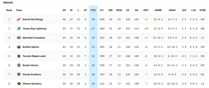 На Сході лідирує Кароліна, а у топ-3 йдуть Детройт і Тампа-Бей – усі здобули перемоги.