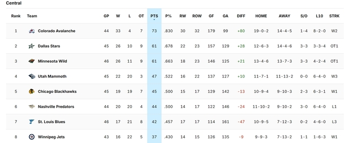 На Заході лідирує Колорадо, а в топ-3 знаходяться Даллас і Міннесота.