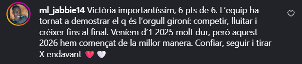 ml_jabbie14: Дуже важлива перемога, 6 очок з 6. Команда вкотре продемонструвала, чим гордиться Жирона: конкурувати, боротися та розвиватися до кінця. Ми завершили дуже важкий 2025 рік, але цей 2026 рік ми розпочали найкращим чином. Вірте, продовжуйте та рухайтеся вперед.